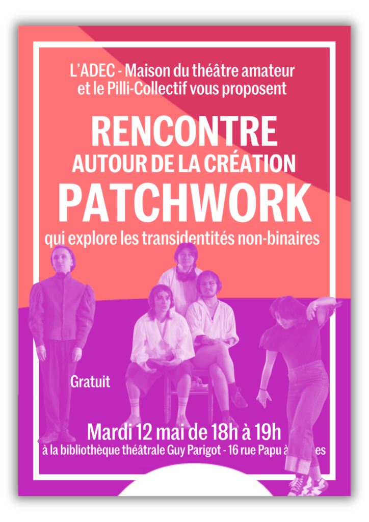 L’ADEC accueille l’équipe artistique du projet “Patchwork”, porté par le Pilli-Collectif, pour une rencontre, à la bibliothèque de l’ADEC. Venez poser vos questions sur cette création et explorer en lecture à voix haute des textes de théâtre, tirés du fonds de la bibliothèque, sur les questions de transidentités, notamment non-binaires.