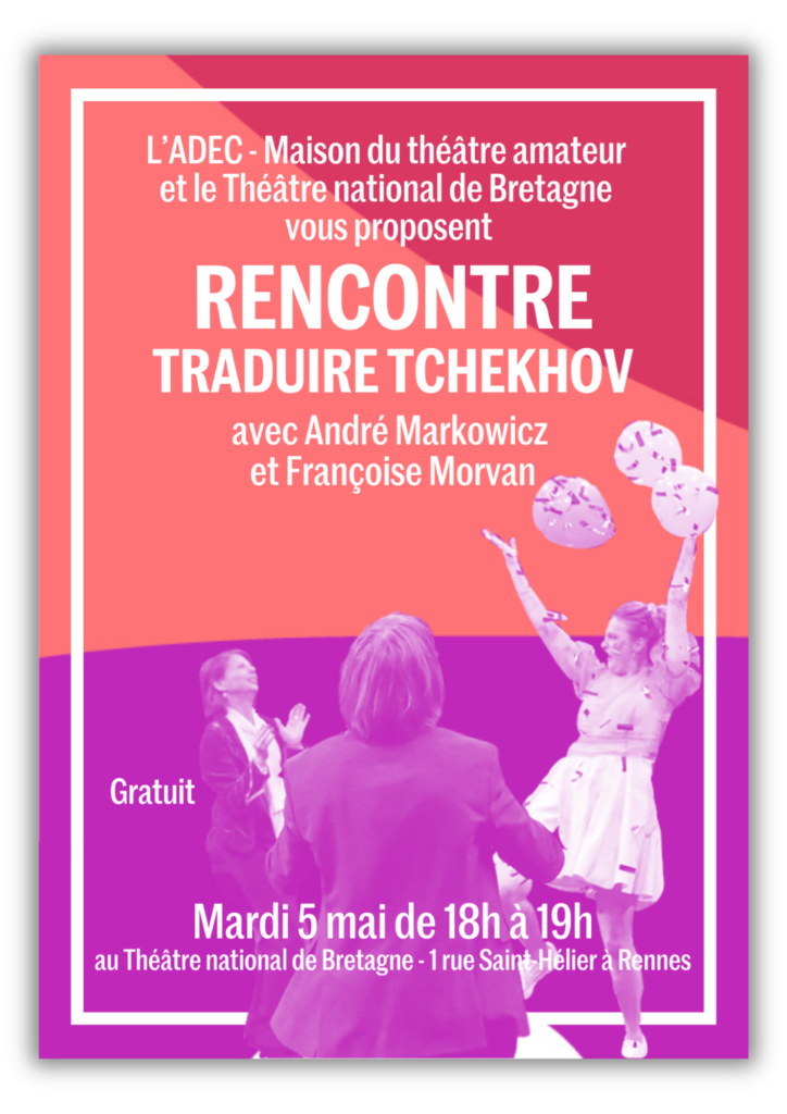 Dans le cadre de la programmation d’”Ivanov”, mis en scène par Myriam Muller, au TNB, l’ADEC vous propose une rencontre avec André Markowicz et Françoise Morvan, qui ont traduit l’œuvre dramatique de Tchekhov.