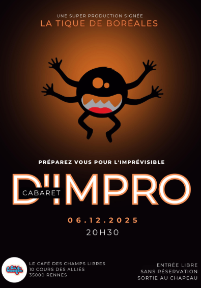 La troupe d’improvisation de Chartres de Bretagne investit le Café des Champs Libres pour un cabaret d’improvisation. Un cabaret où des scènes complètement improvisées prennent vie sous vos yeux. Un spectacle rythmé par un maître de cérémonie au regard affûté. Prêt à l’imprévisible? Rendez-vous le Samedi 06 décembre à 20h30