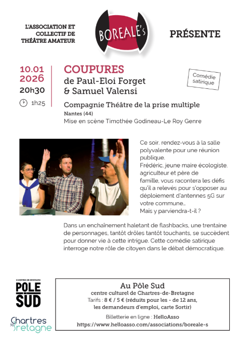 Troupe invitée par Boréale’s. Une comédie satirique de Paul-Eloi Forget & Samuel Valensi. Ce soir, rendez-vous à la salle polyvalente pour une réunion publique. Frédéric, jeune maire écologiste, agriculteur et père de famille, vous racontera les défis qu’il a relevés pour s’opposer au déploiement d’antennes 5G sur votre commune… Mais y parviendra-t-il ? Dans un enchaînement haletant de flashbacks, une trentaine de personnages, tantôt drôles tantôt touchants, se succèdent pour donner vie à cette intrigue. Cette comédie satirique interroge notre rôle de citoyen dans le débat démocratique.