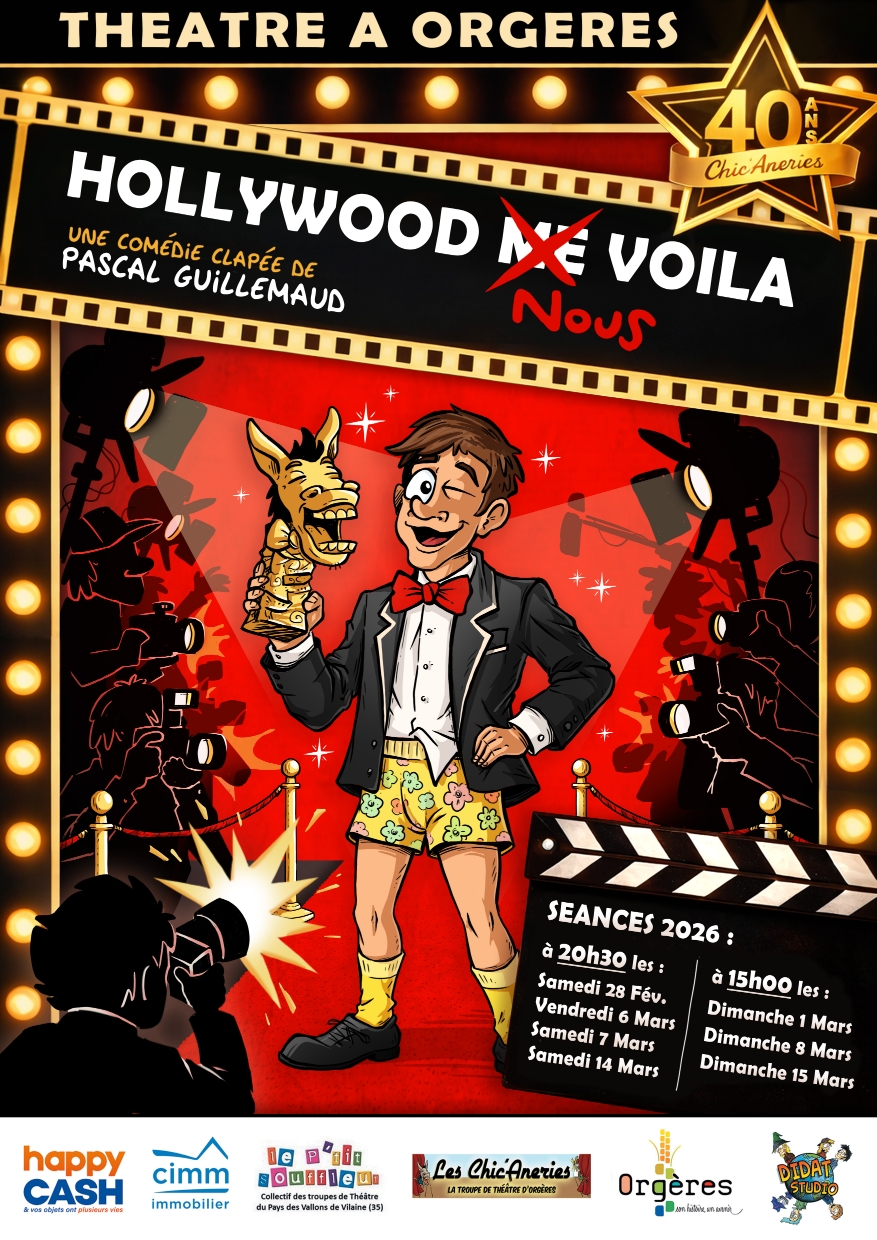 Une comédie en 2 actes de Pascal Guillemaud. Pour cette saison anniversaire des 40 ans, on vous déroule le tapis rouge et on vous promet autant de rires que de strass et de paillettes. Yes, Les Chic’Aneries vont vous faire leur cinéma et vous dévoiler le Hall of Fame d’ORGERESWOOD. Alors … Braquez les projecteurs – Silence – Moteur – Action – Ca tourne ! Les Chic’Aneries Productions vous présentent un scénario rocambolesque, un casting alléchant totalement loufoque et des scènes hollywoodiennes, ça va s’affoler en plateau !🎥 Bande Annonce : Ricky la belle vie, of course ! Pitch : Ricky, rêve sa vie sur grand écran, et tente le tout pour le tout avec sa Blue Agent pour décrocher The rôle Outre Atlantique. Par contre, dans le script, il n’était pas précisé que les figurants de sa vie étaient déjà de sacrées Stars qui se succéderont en un tourbillon de rebondissements … et malheureusement, rien ne sera coupé au montage. 📽