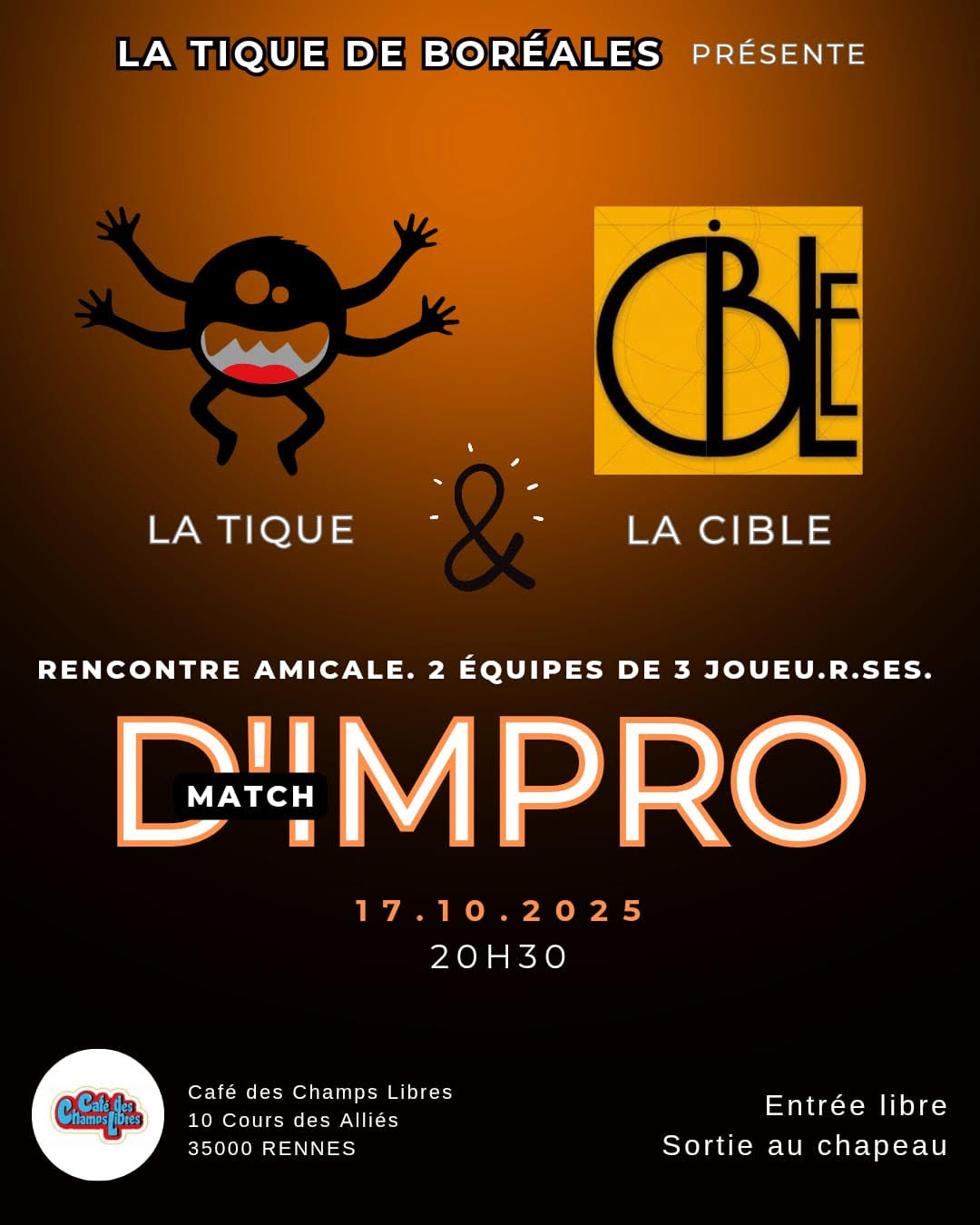 La troupe d’improvisation de Chartres de Bretagne investit le Café des Champs Libres pour une rencontre face à la redoutable CIBLE. Un 3 contre 3 où des scènes complètement improvisés prennent vie sous vos yeux. Un spectacle rythmé par un maître de cérémonie au regard affûté. Prêt à l’imprévisible? Rendez-vous le Vendredi 17 octobre à 20h30