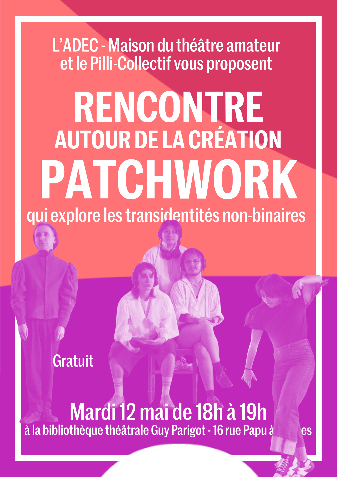 L’ADEC accueille l’équipe artistique du projet “Patchwork”, porté par le Pilli-Collectif, pour une rencontre, à la bibliothèque de l’ADEC. “Patchwork est une création autour de la non-binarité. C’est une forme hybride qui comporte à la fois une installation artistique et un spectacle. Ayant pour but de partager une expérience sensible de nos parcours trans et non-binaire dans leur diversité et leur multiplicité, les six interprètes de Patchwork donnent à voir de nouvelles représentations et font entendre des voix qui ne s’expliquent et ne s’excusent pas. Pour cela, de nombreux mediums artistiques sont explorés : écriture, composition musicale, danse, drag, arts plastiques… Patchwork raconte la découverte, l’évidence de la non-binarité, la colère, les figures inspirantes. N’oubliant ni notre humour ni notre joie, Patchwork est une invitation à questionner la norme établie.” Venez poser vos questions sur cette création et explorer en lecture à voix haute des textes de théâtre, tirés du fonds de la bibliothèque, sur les questions de transidentités, notamment non-binaires.