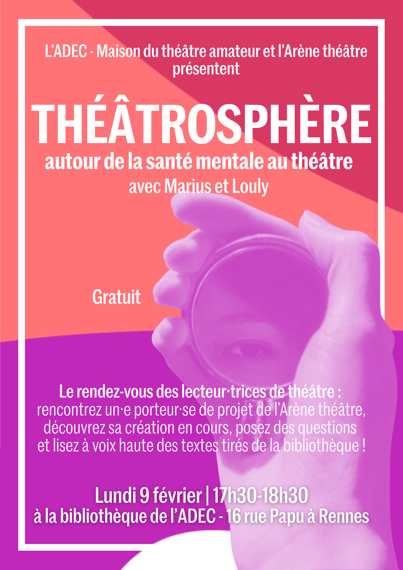 Ce rendez-vous est conçu en partenariat avec l’Arène théâtre, l’association étudiante de Rennes 2 qui permet à une sélection de projets de voir le jour pour deux festivals par an : “Entrez dans l’Arène”, en mars sur le campus de la fac, et “Les Nocturnes insolites”, en mai au théâtre de l’ADEC. Les temps de rencontres que sont les Théâtrosphères sont conçus dans une optique d’accompagnement de la création théâtrale étudiante : chaque session vous propose de découvrir l’une des créations qui sera présentée lors des deux festivals. Pas besoin de s’y connaître en théâtre pour y participer : il suffit d’être curieux·se !