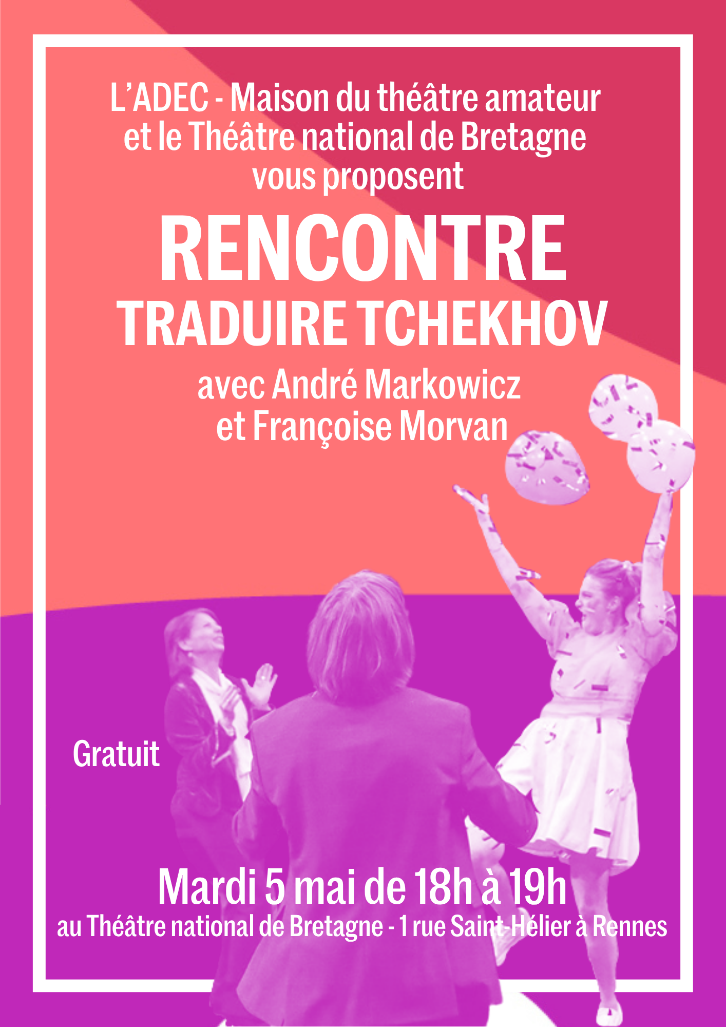 Au théâtre de l'ADECDans le cadre de la programmation d'"Ivanov", mis en scène par Myriam Muller, au TNB, l'ADEC vous propose une rencontre avec André Markowicz et Françoise Morvan, qui ont traduit l'œuvre dramatique de Tchekhov (Actes Sud, Babel).