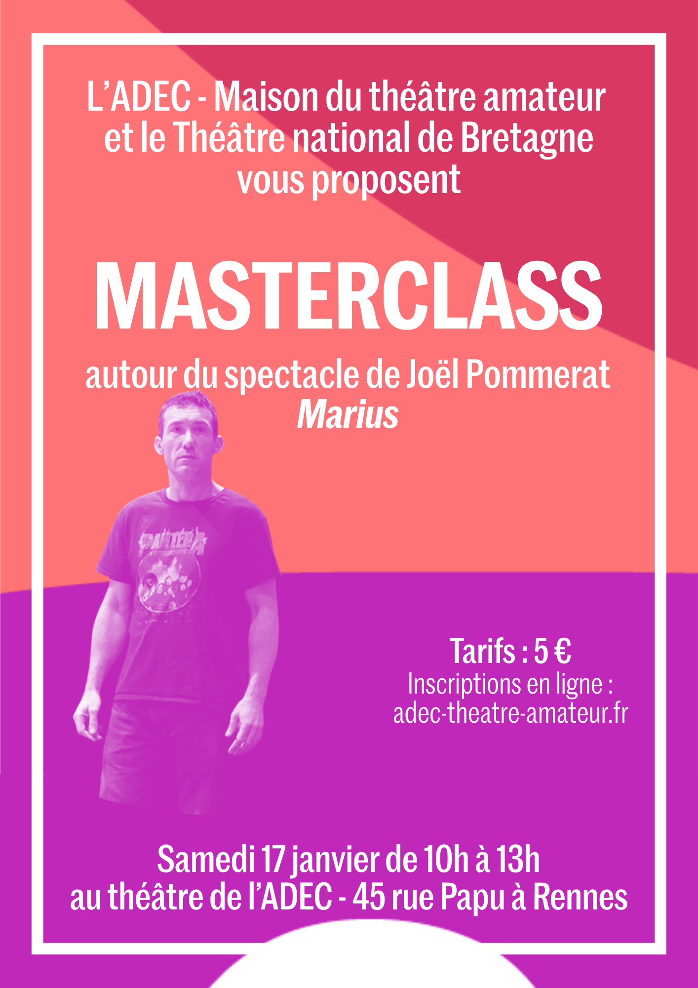 Au théâtre de l'ADECL'ADEC-Maison du théâtre amateur vous propose une masterclass avec un·e artiste de l'équipe artistique du spectacle "Marius" de Joël Pommerat, joué du 6 au 23 janvier au TNB.