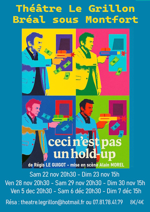 Le Grillon Rue Jeanne-d’Arc, Bréal-sur-MontfortUne comédie de Régis Le Guigot. La carte bleue de Jacques vient d'être avalée par le distributeur. Qu'à cela ne tienne, un rapide détour par le guichet de la banque et le tour sera joué. Sauf que Jacques se balade avec, dans sa poche, le cadeau acheté pour l'anniversaire de son neveu, un joli revolver plus vrai que nature... Sauf qu'en apercevant le joujou de Jacques, le personnel de la banque est persuadé qu'un hold-up se prépare...