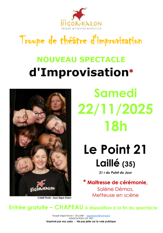 Point 21 à Laillé 21 rue du Point du jour, LailléLa troupe de théâtre d'improvisation "Les Digor-Kalon" sera sur scène le samedi 22 novembre 2025, à 18h, salle scène du Point 21 à Laillé (21 rue du Point du Jour). Le spectacle aura un fil rouge : Les générations !