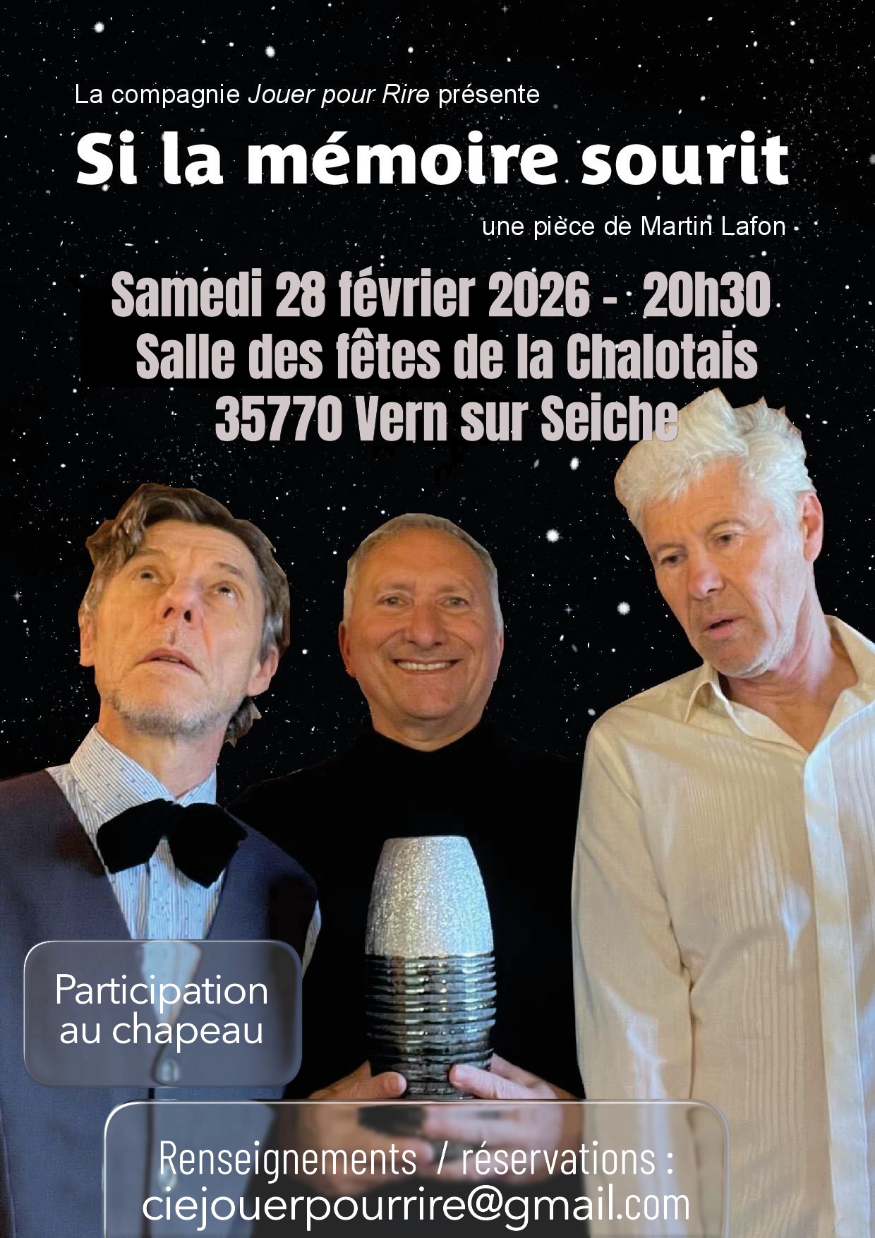 Salle de la Chalotais Avenue de la Chalotais, Vern sur SeicheUne pièce de Martin Lafon. Trois amis de longue date : David, Vincent et Jésus. Le ciel leur tombe sur la tête ! Perdre la santé, la mémoire ou même la vie, ce n’est pas rien. Alors, il y a la tentation des faux-fuyants et du déni. Heureusement, il y a l’humour et aussi la vérité… l’amitié y survivra-t-elle ?