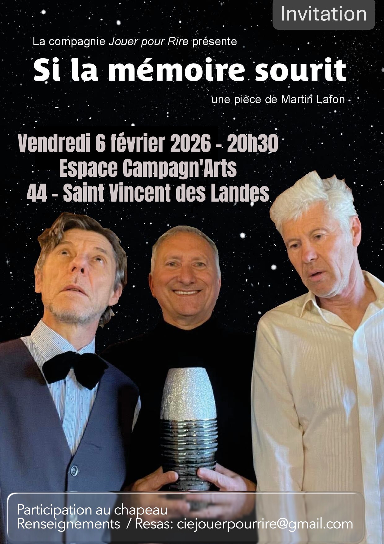 Espace campagn'arts 21 Rue d'Issé, Saint-Vincent-des-LandesUne pièce de Martin Lafon. Trois amis de longue date : David, Vincent et Jésus. Le ciel leur tombe sur la tête ! Perdre la santé, la mémoire ou même la vie, ce n’est pas rien. Alors, il y a la tentation des faux-fuyants et du déni. Heureusement, il y a l’humour et aussi la vérité… l’amitié y survivra-t-elle ?