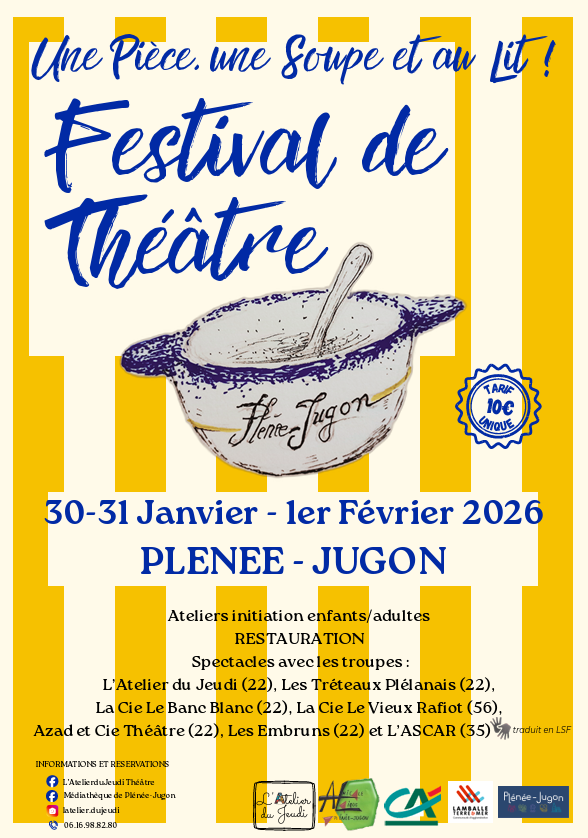 Plénée-Jugon Plénée-JugonAprès une première édition en janvier 2024, saluée pour son originalité et son esprit convivial, le Festival de Théâtre amateur de Plénée-Jugon dénommé « Une pièce, une soupe et au lit ! », revient en 2026 (affiche et programme joints, à partager) avec une ambition renforcée : mettre à l'honneur le théâtre amateur dans un cadre professionnel, tout en créant un moment de partage, d'échange et de solidarité entre artistes, public et territoire. Un événement inclusif, multigénérationnel et engagé. Ce festival, qui se déroulera sur un week-end, propose une programmation variée et accessible à tous : des spectacles pour petits et grands, des ateliers participatifs dès 4 ans, une clôture en langue des signes avec la pièce "Juliette et Roméo" interprétée par le Groupe L'ASCAR, un tarif solidaire : 10€ pour l'ensemble du festival, gratuit pour les moins de 15 ans et une restauration locale et abordable.