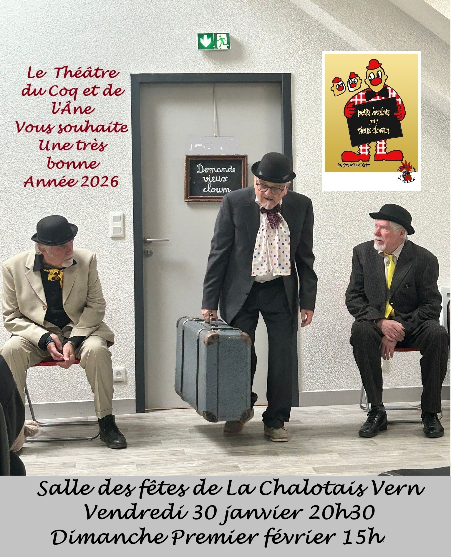 Salle de la Chalotais Avenue de la Chalotais, Vern sur SeicheUne annonce a été publiée dans un journal: "Demande vieux clowns". Trois vieux clowns se retrouvent dans la salle d'attente. Après la joie des retrouvailles, l'évocation des bons souvenirs, naît l'angoisse de la compétition. Tous, persuadés de leur talent, vont employer tous les moyens pour dissuader les deux autres de se présenter à cette audition.