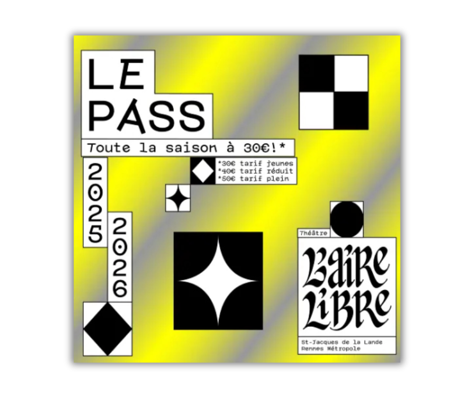 Cette saison, profitez d’une offre billetterie exceptionnelle en tant qu’adhérent·e à l’ADEC pour bénéficier d’une remise sur le Pass pour toute la saison du Théâtre de l’Aire libre, à Saint-Jacques-de-la-Lande : 40 € au lieu de 50 € !